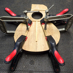 Now I glue the strengthening strip along the spine of the back.  This is cross grained timber to add strength to this join in the bookmatched pair that make up the back skin.  I am using the same mango timber that makes up the body - only the grain now runs at right angles to the grain of the back.